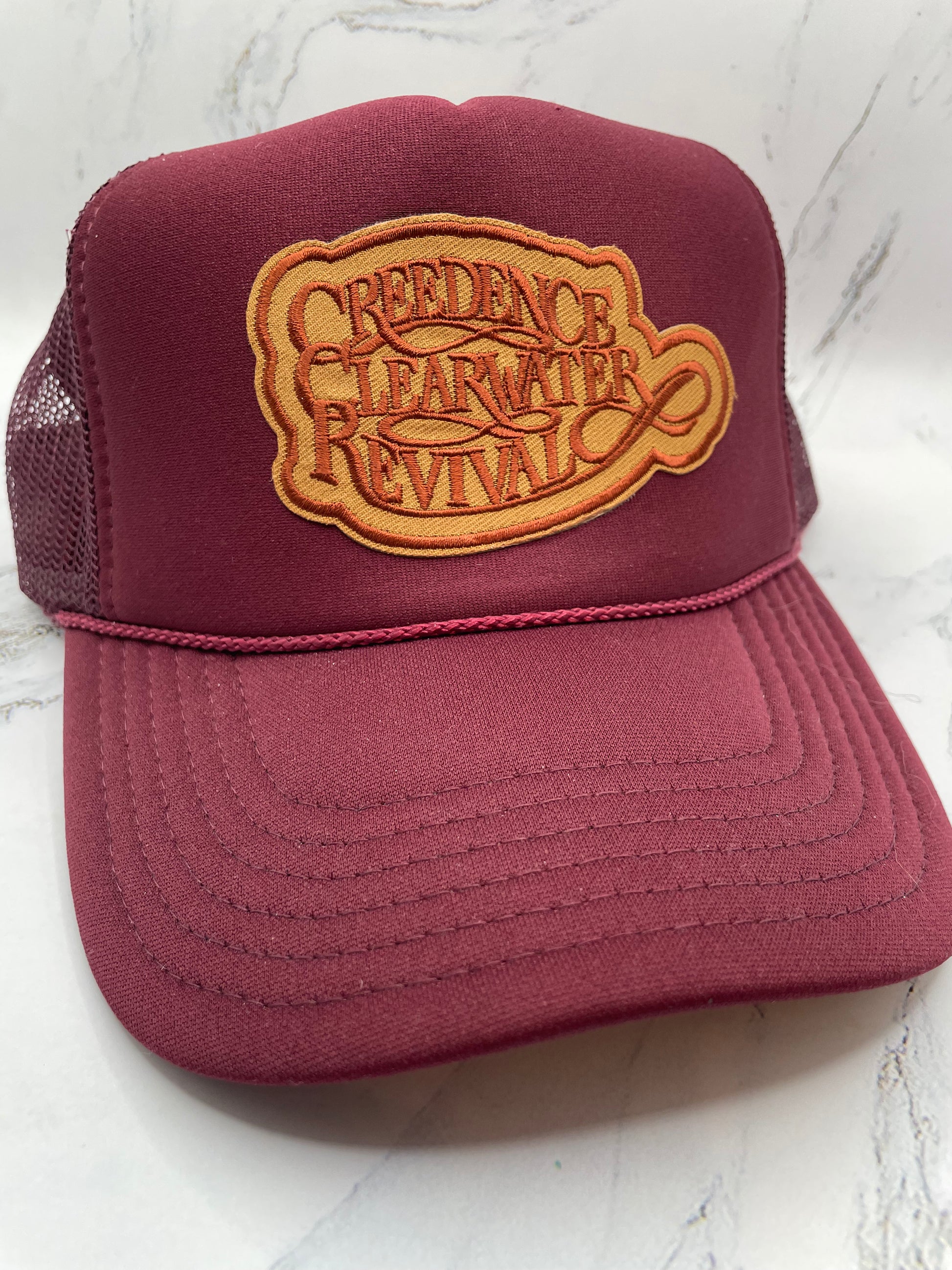 Embroidered Creedence Clearwater Revival patch on a maroon foam trucker hat