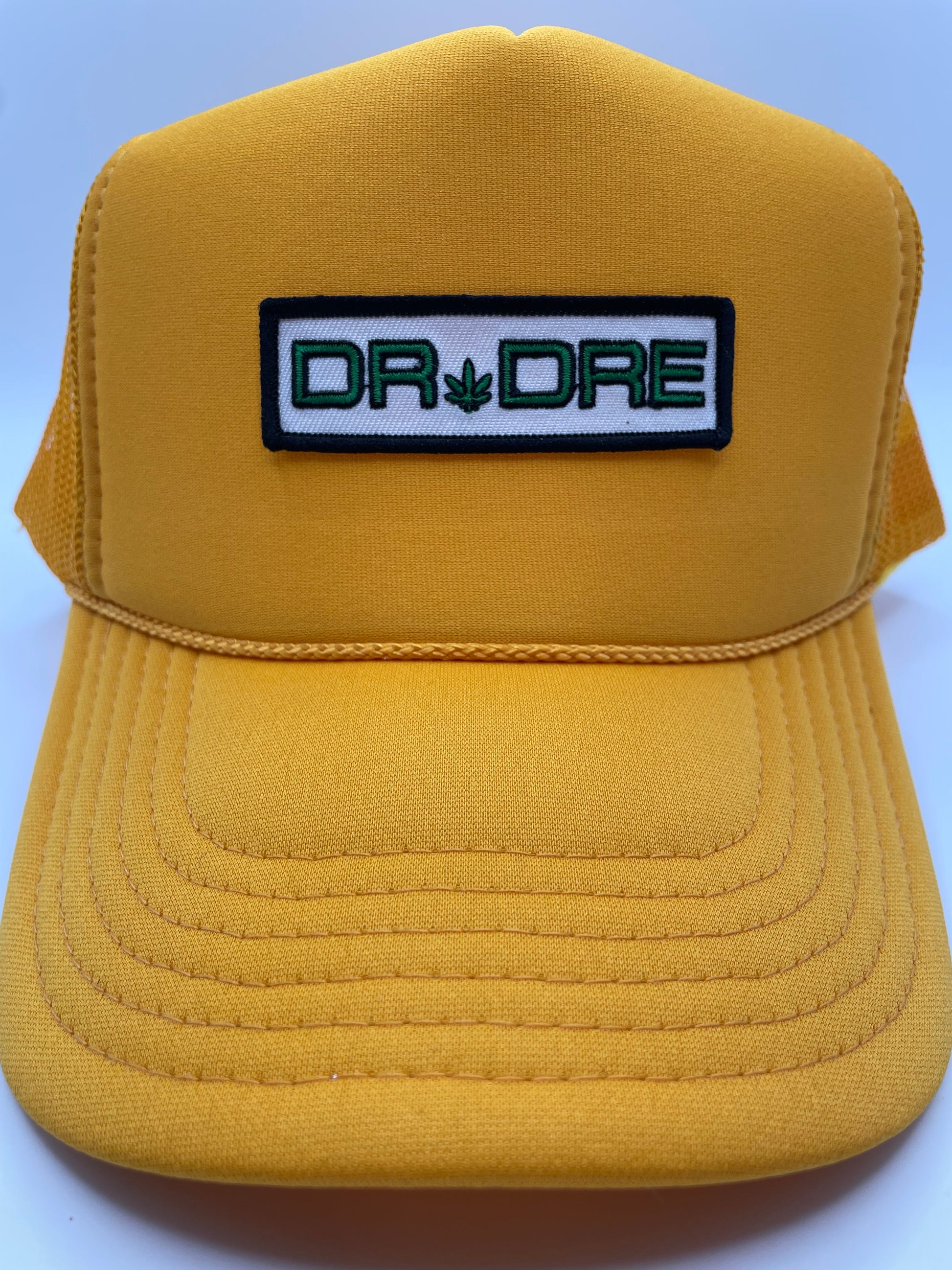 Embroidered Dr. Dre Chronic patch on a yellow foam trucker hat.