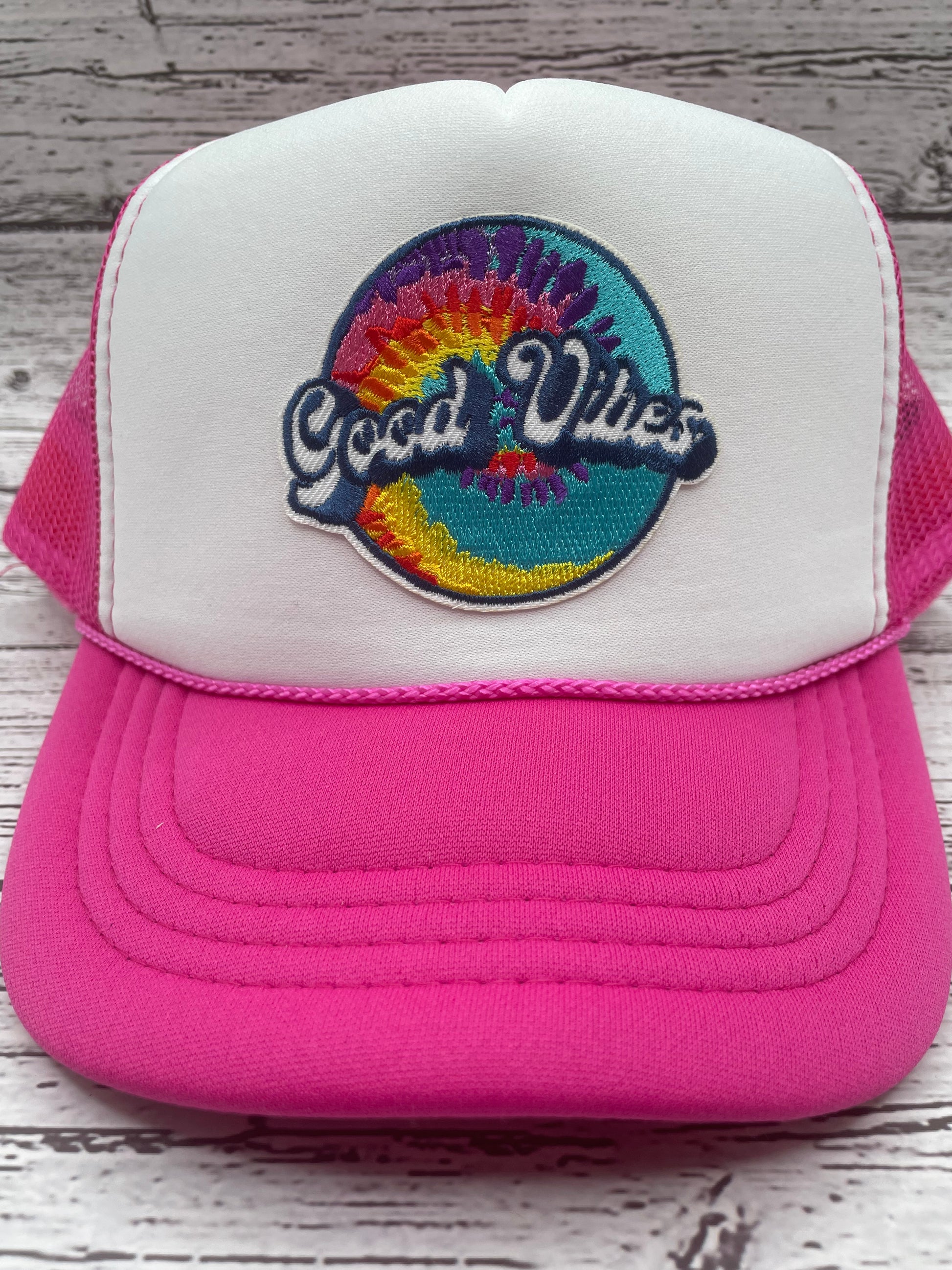 Tie-dye Good Vibes embroidered patch on a hot pink and white foam trucker hat. See all color options.