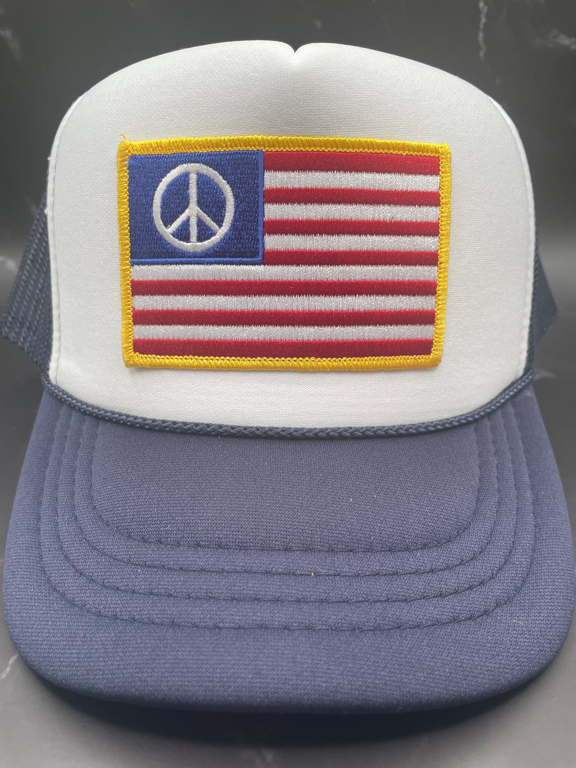 American flag with peace sign embroidered patch on a navy and white foam trucker hat. See all color options.