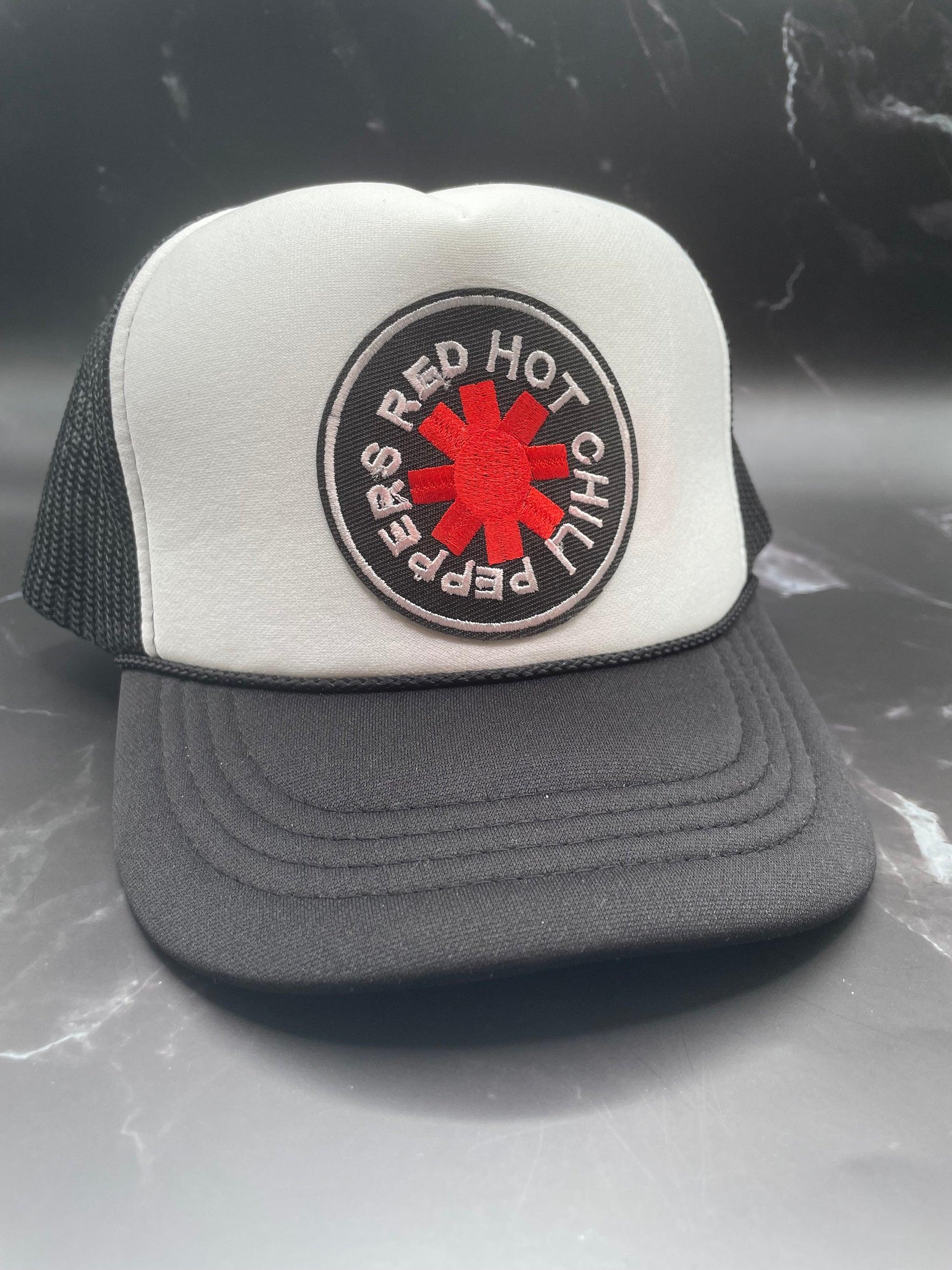 Embroidered Red Hot Chili Peppers patch on a black and white two-tone foam trucker